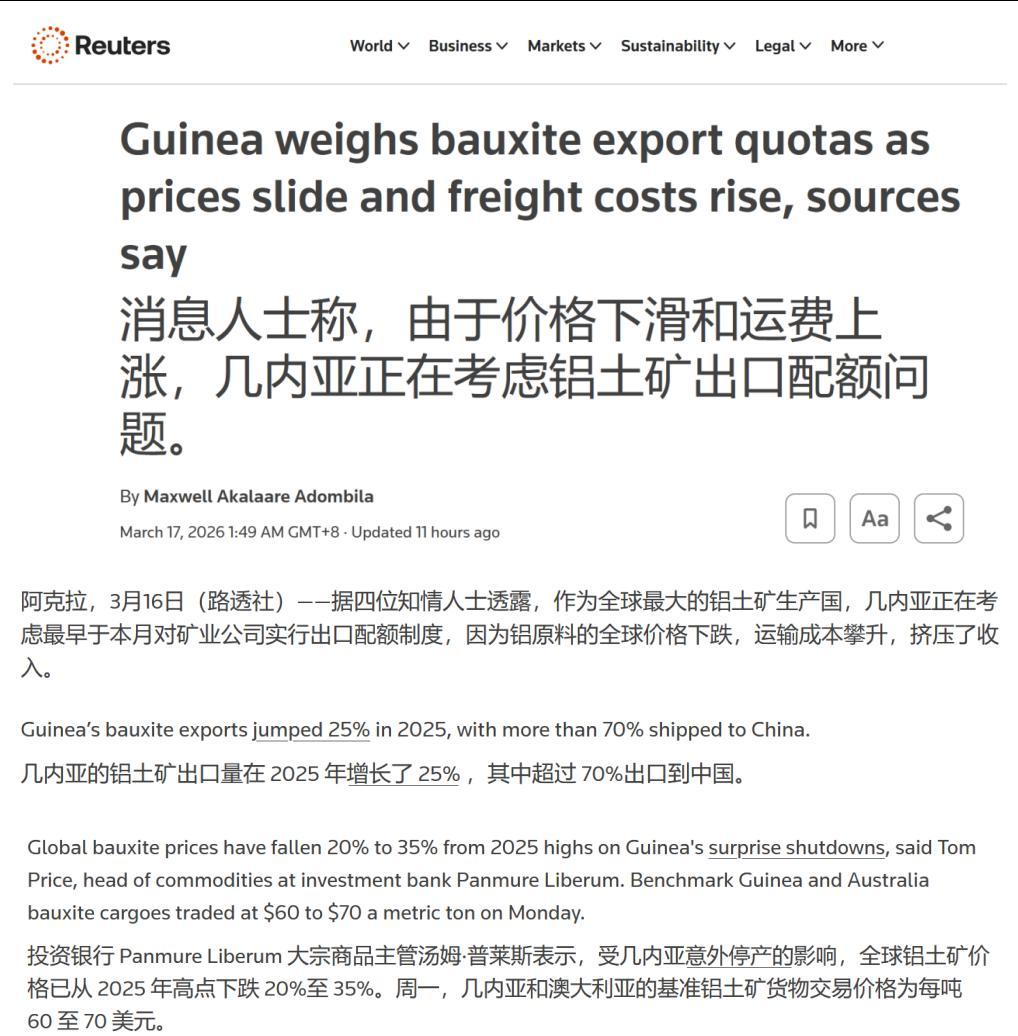 这个音书看起来仅仅一次行业整顿,但几内亚供应了环球超越四成的铝土矿,2025年中国入口的铝土矿里有77%来自这个西非国度。我的判断是,这是资源国在巨额商品订价权上的又一次主动出击,中国铝产业链的原料成本玩忽率会被迫抬升。