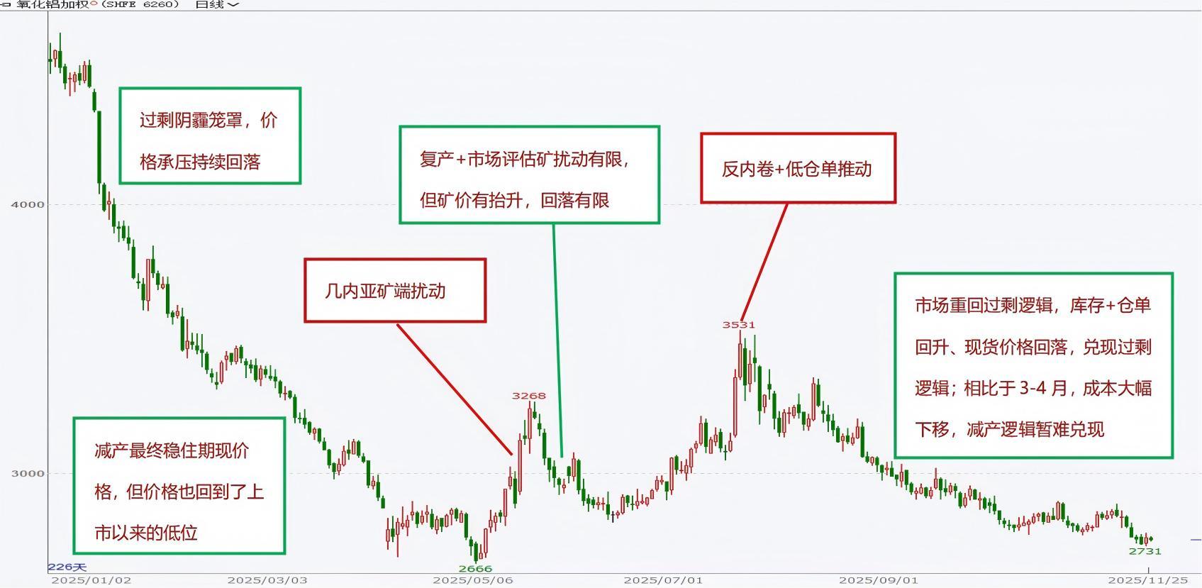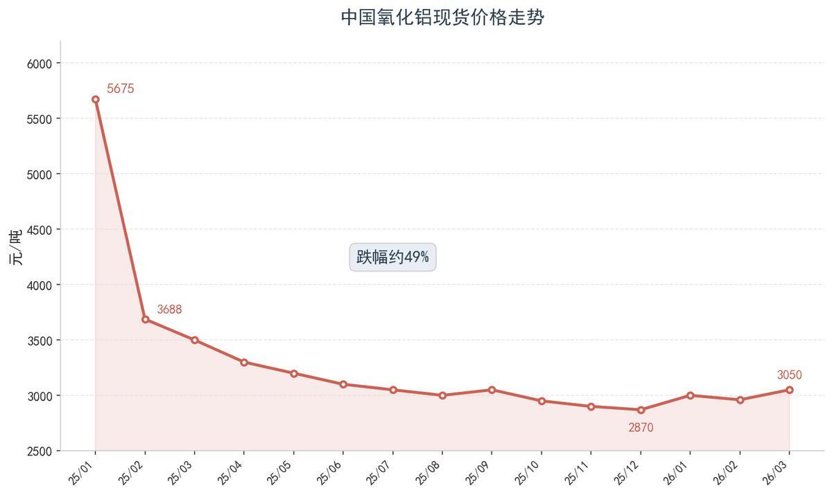 往常一年多,铝土矿价钱从高位回落了两到三成,氧化铝价钱更是从2025年高点价钱每吨5675元一都跌到不及3000元,跌幅接近一半。