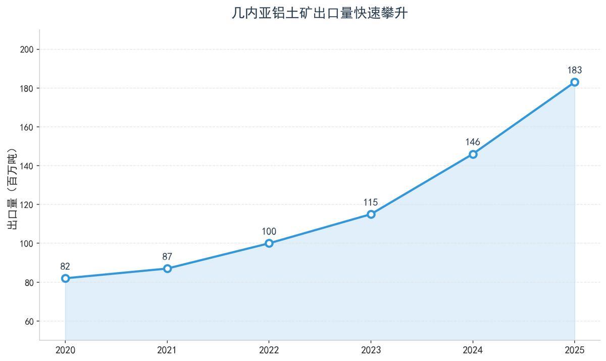 这个操作有多大影响?2025年几内亚铝土矿出口量达到1.83亿吨,同比增长了25%。其中颠倒一部分产能是矿企超出许可证计算坐蓐的。如若严格推论许可证上限,出口量可能回落到1.5亿吨以致更低。环球海运铝土矿商业量2025年约2.57亿吨,几内亚占了68%。一朝供给减弱两三千万吨,商场的供需均衡会被赶紧冲破。