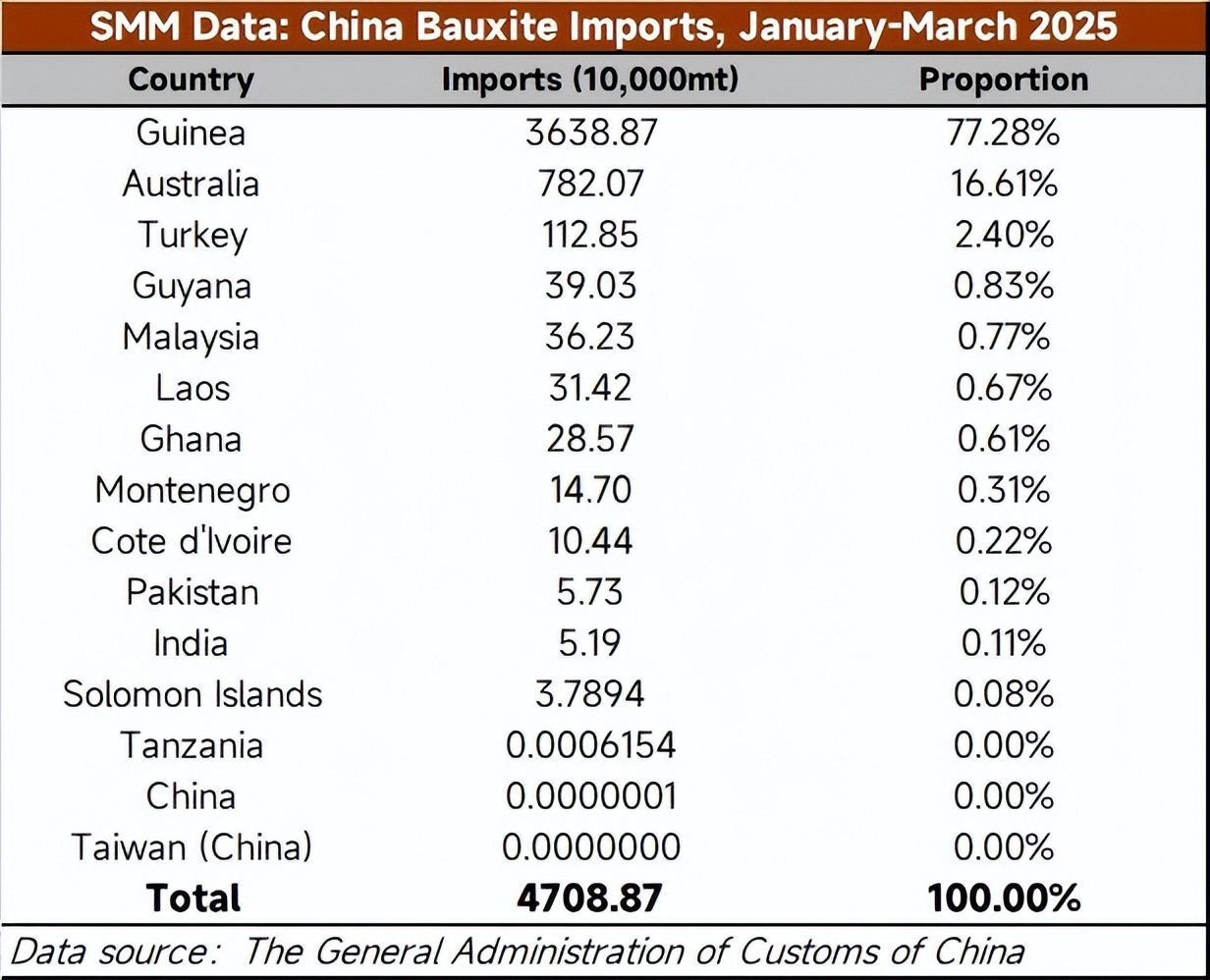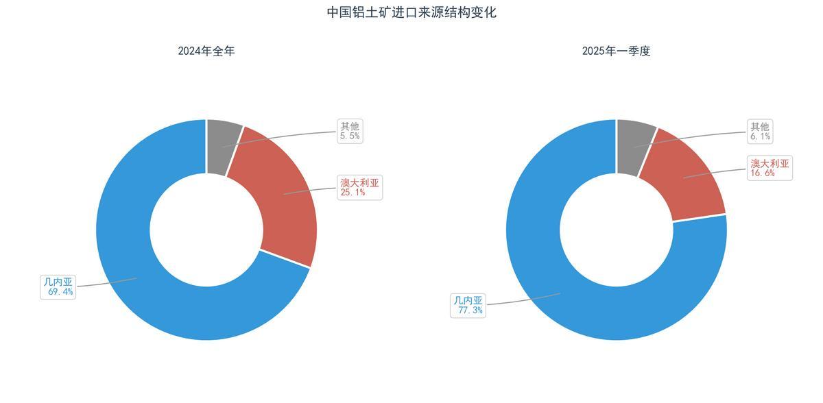 几内亚的情况有极少不同。铝土矿的环球储量散布比钴和锂更贴近,几内亚的储量和品位上风短期内很难被替代。澳大利亚是第二大供应国,但2025年一季度中国从澳大利亚入口的铝土矿只占总量的16.6%,而况澳矿同比还下落了1.8%,扩产空间有限。