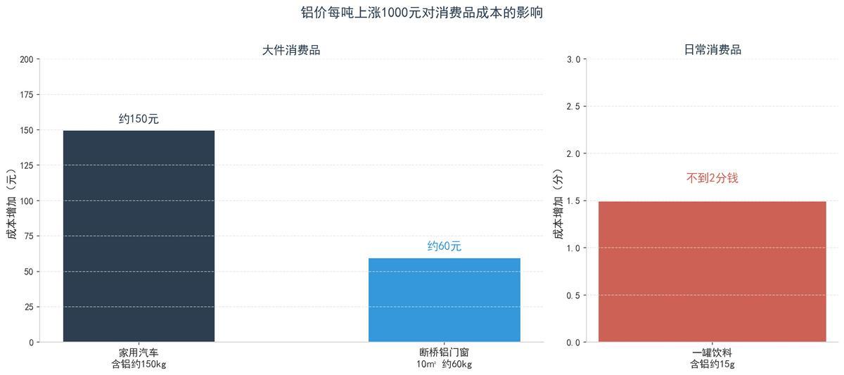 作念一个爽脆的测算。假定铝价每吨高潮1000元,一辆平日家用车的含铝量约莫在150公斤傍边,材料成本会加多约150元。家里装修换一套10平方米的断桥铝门窗,铝型材用量约莫60公斤,成本加多约60元。一罐饮料的铝用量约莫15克,铝价涨1000元对应单罐成本加多不到2分钱,消耗者实在感受不到,但对饮料企业来说,一年卖几十亿罐,成本压力就很可不雅了。