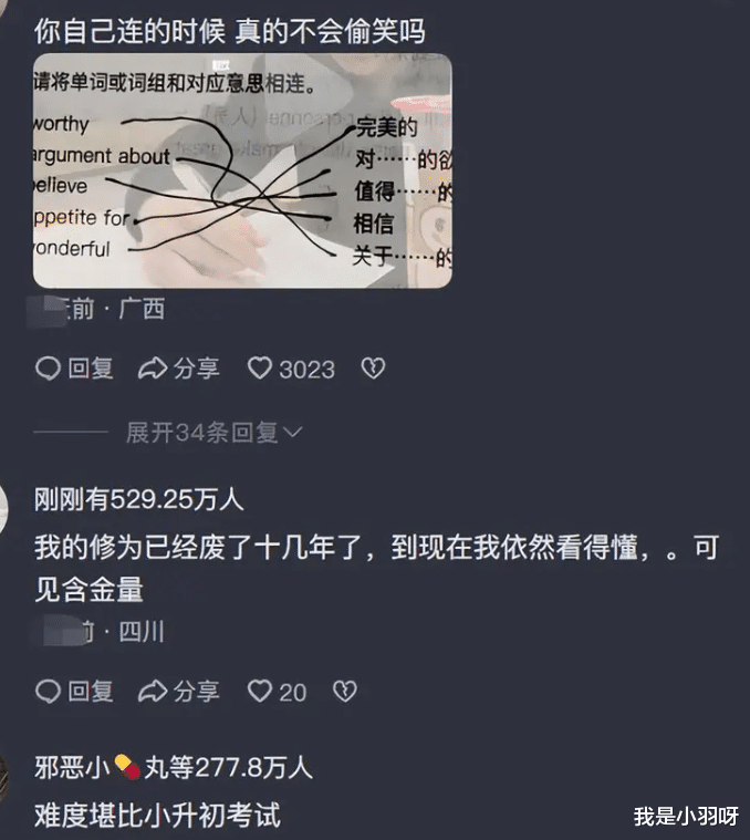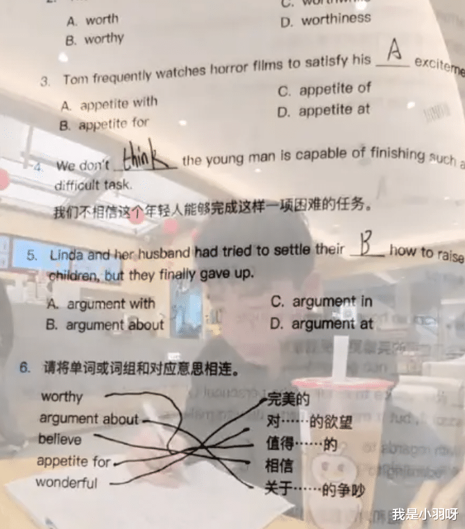 他作念的英语题难度还不到中考水平,一起连线题连得歪七扭八,看着连小学生齐不如。