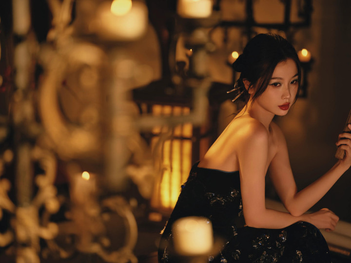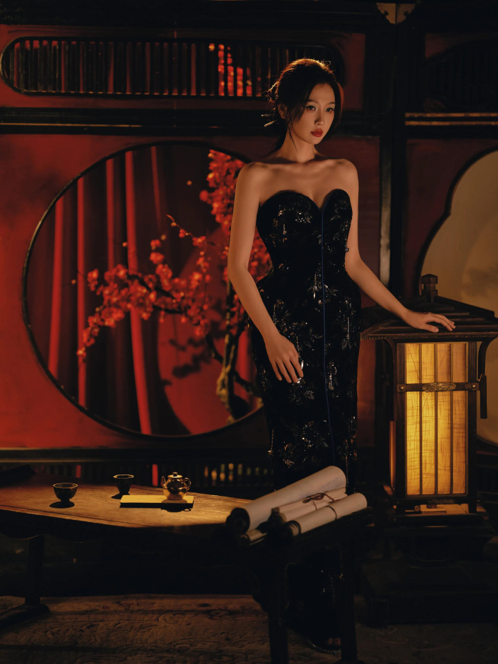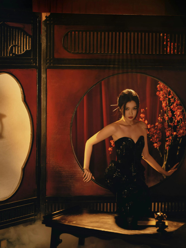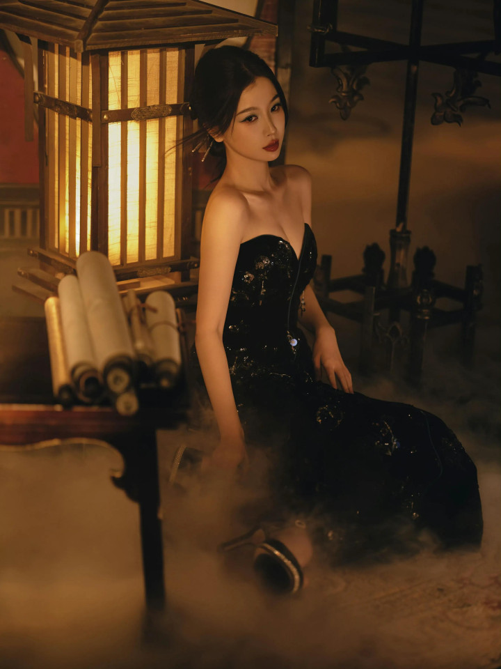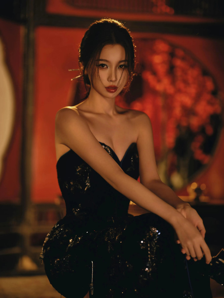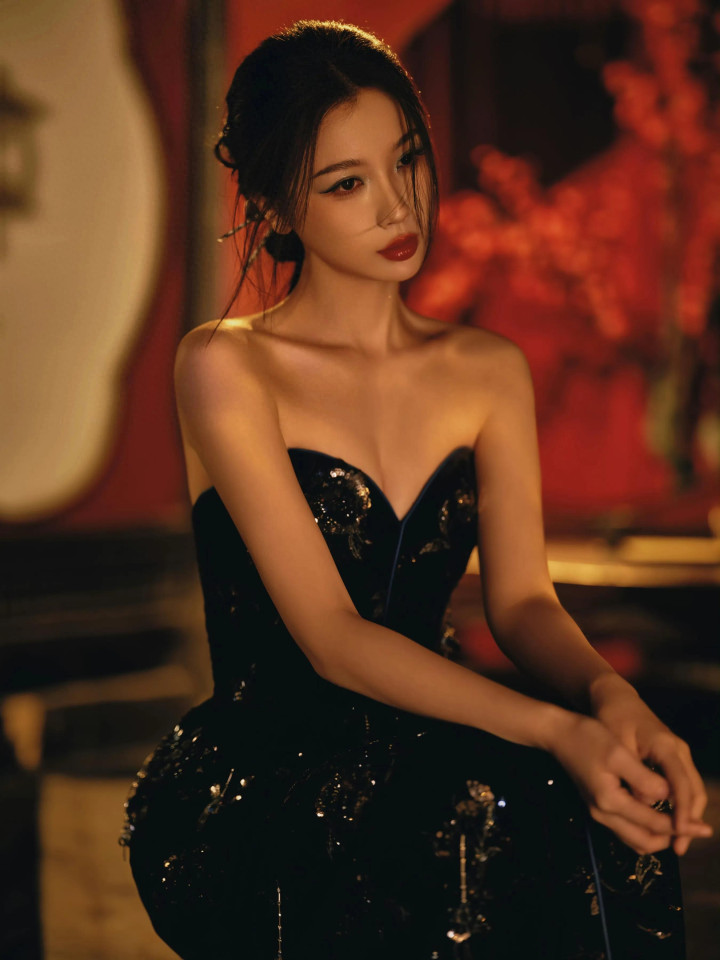 九游jiuyou 虞书欣, 玄色抹胸连衣裙, 大秀香肩, 红唇柔媚