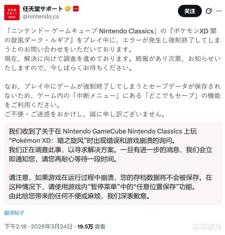 5、《宝可梦XD》NS2版出现崩溃问题,任天国致歉并访问