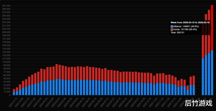 天然赶上细致服的档期,但《魔兽全国》周年服TBC似乎影响不大,在外服持续了开服时的盛况。据Ironforge.pro的最新数据表示,现在参与团本和竞技场的周玩家总和已进步30万,达到一个新的峰值,上一次如斯高的热度照旧2024年大灾变怀旧刚开的时候。