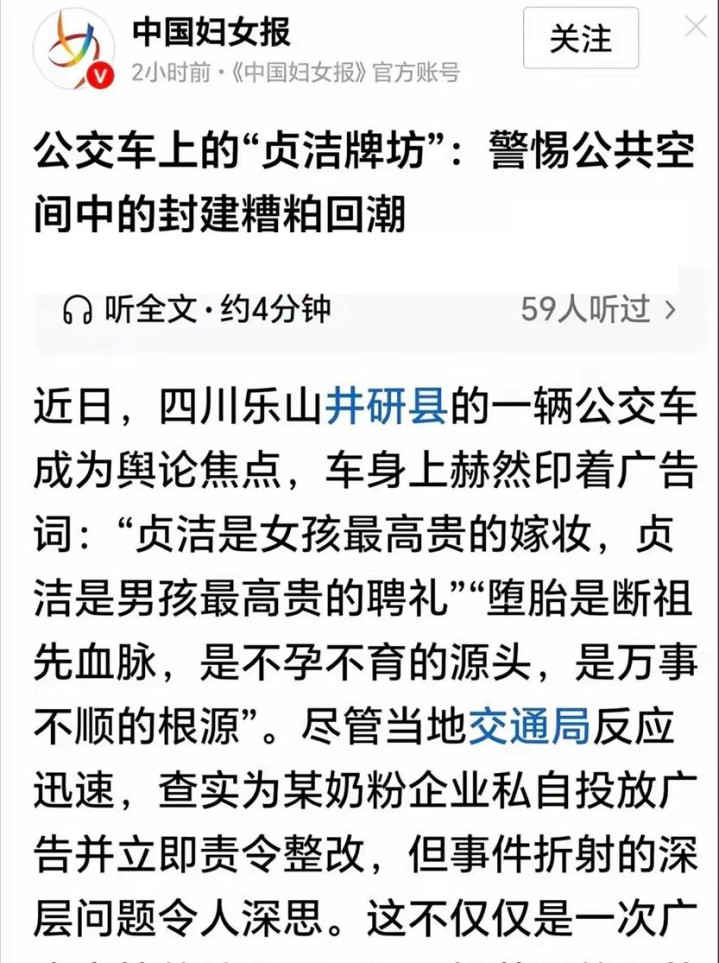 《新京报》开端,《中国妇女报》断后,对四川乐山的公交告白横加批判,锋芒针对的等于“贞洁”二字,《中国妇女报》的批驳著述标题等于:公交车上的“贞洁牌楼”