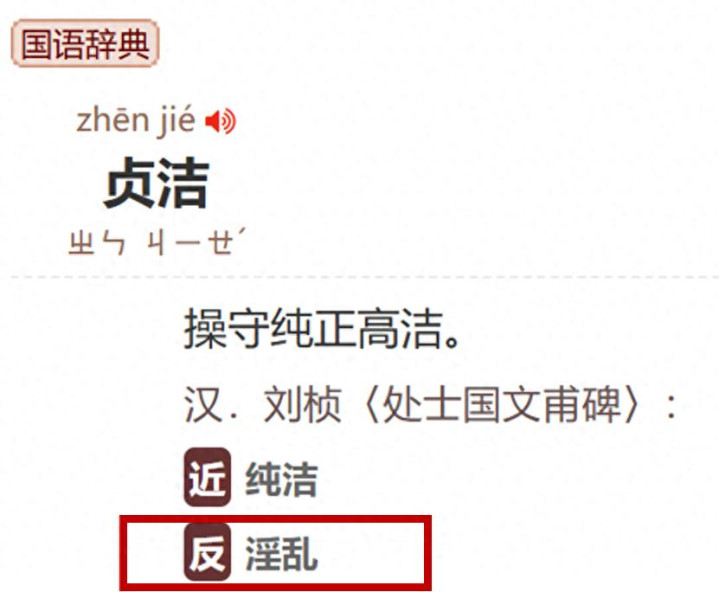 两张图,来自国语辞典,鉴识讲授“贞洁”和“贞节”。
