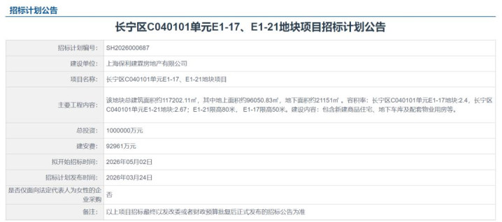 保利发展旗下的上海保利建霖房地产有限公司发布了长宁区C040101单位E1-17、E1-21地块的招标公告,技俩总投资100亿元,另有建安费92961万元。